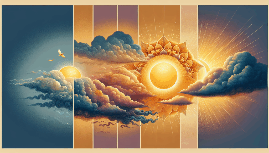 The Sun — the Self, the I AM — shines through all three, unaffected. Clouds change. Rainbows appear and dissolve. Physical light comes and goes. But the Sun remains exactly as it is. Your reality is like the Sun. The three bodies go on changing moment to moment. The witness behind them does not change at all.